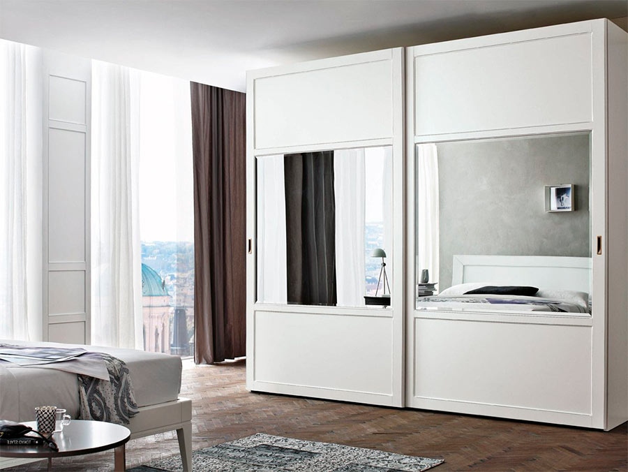 В маленькой комнате удобнее будет иметь стандартный вариант с одной или двумя дверьми. За счет прямоугольной формы изделия можно существенно сэкономить пространство спальни. А если сделать полотна створок зеркальными, то визуально площадь помещения увеличится, а комната будет казаться более светлой.
