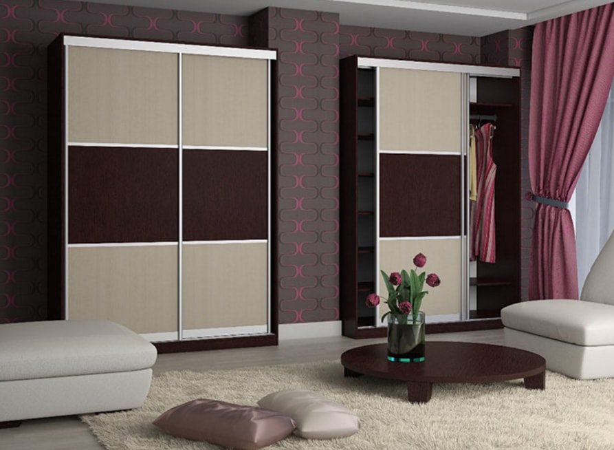 Раздвижные створки изготавливают из стекла, а также традиционных ДСП и МДФ. Популярностью пользуются комбинированные фасады в разных сочетаниях. Количество створок зависит от длины шкафа и ширины полотна. Благодаря оптимальному соотношению красоты, удобству эксплуатации, бюджетной стоимости фурнитуры, востребованы двух-, трехдверные конструкции.
