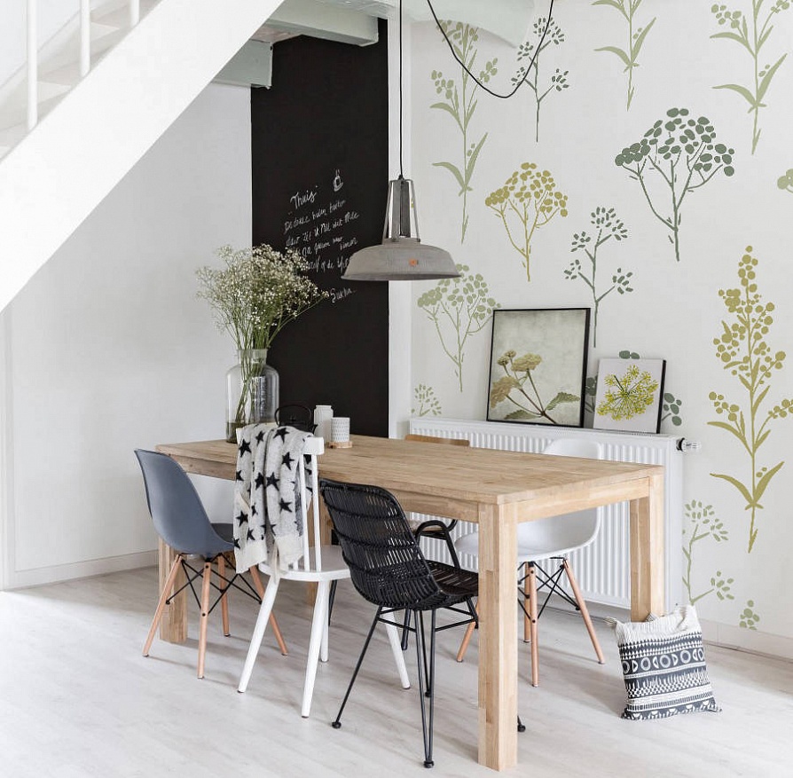 - Декоративное оформление стен. Выбирайте дерево, чтобы оформить яркие или наоборот черно-белые фотографии, необычные коряги, композиции из веточек идеально впишутся в скандинавский интерьер. Одну из стен можно сделать грифельной, чтобы каждый день рисовать новые пейзажи или абстракцию, писать напоминания или пожелания на целый день. Повесьте на стену яркие текстильные шторы, имитируя занавес окон или текстильные панели пастельных тонов. Такие дизайнерские ходы помогут выделить определенные зоны, сделать яркие акценты и немного освежить или даже осовременить квартиру или дом. Оформляя стены, не забывайте о растительном принте, который не только сейчас в моде, но и подчеркнет принадлежность скандинавского стиля к природе.