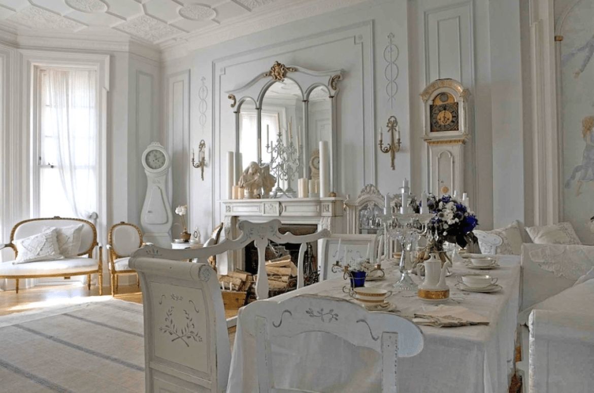 Самый необходимый аксессуар на севере — люстры, лампы, светильники, канделябры. В густавианском дизайне декоративные шикарные люстры и подсвечники отлично контрастируют с чистым белом фоном. Только представьте себе, как эффектно выглядит хрусталь со множеством подсвечников над простыми столами и стульями.