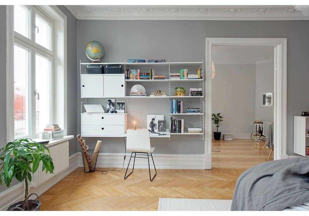 Что касается декора, то к нему в скандинавском направлении относятся многочисленные системы хранения: открытые и закрытые полки, стеллажи, подвесные контейнеры, ящики, корзины, вешалки, которые наполняются красивыми вещами.