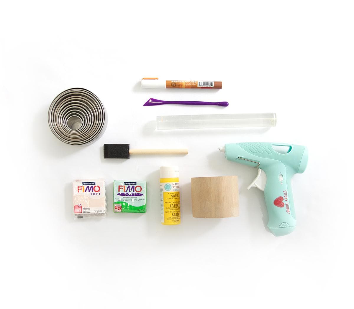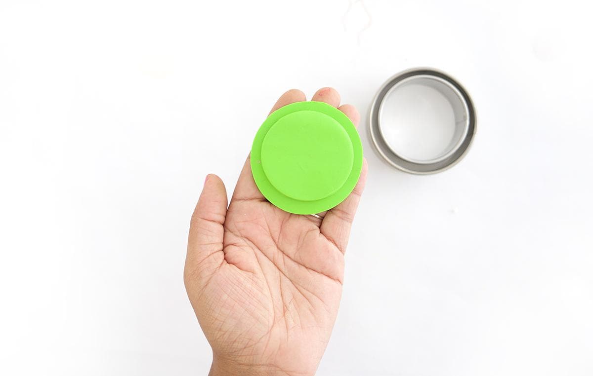 Выдавливаем кружочки из полимерной глины зеленого цвета. Запекаем их и склеиваем между собой.