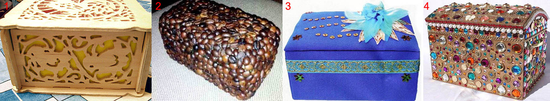 Сплошная оклейка картонной коробки мелкими твердыми элементами: кофейными зернами (поз. 2), морской ракушкой и т.п., даст шкатулку не менее прочную и долговечную, если клеить термопистолетом, а поверх покрыть акриловым лаком. Дополнительная оклейка декоративной тканью (поз. 3) с прослойками мебельного поролона марки от 35 толщиной 5-7 мм сделает картонную шкатулку долговечной при аккуратном обращении с ней, но, если ее уронить вместе с содержимым, то, скорее всего, помнется. А вот поклейка по картону мелочи вразброс с промежутками (поз. 4) только ослабит изделие.