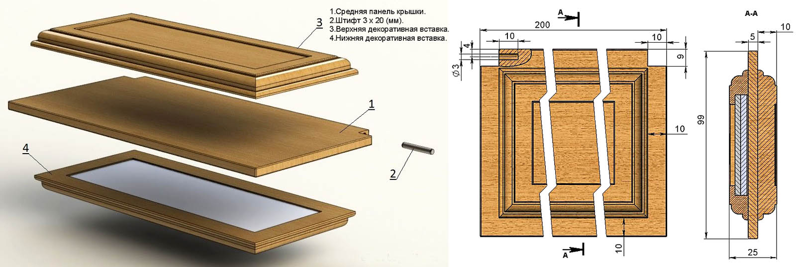 Деревянная шкатулка проще всего украшается инкрустациями: эта техника также дает обширные выразительные возможности и не требует вырабатываемых многолетней практикой навыков, см. видеоурок: