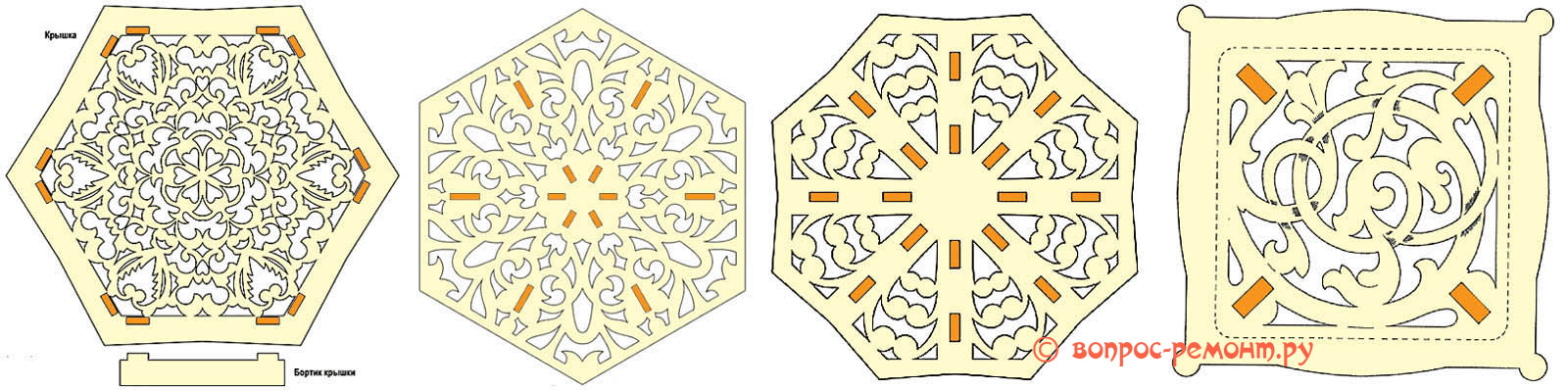 Некоторые схемы узоров различной художественной, но не технологической сложности для крышек шкатулок из фанеры (см. далее) даны для примера на рис. Рыжим отмечены пазы под фиксаторы крышки. Слева это бортик; в остальных случаях ребра. Ребра со скосом наружного края лучше: работа проще (не надо сопрягать углы), торцы шипов теряются в общем декоре или даже дополняют его, а крышка с фиксацией ребрами никогда не застревает.