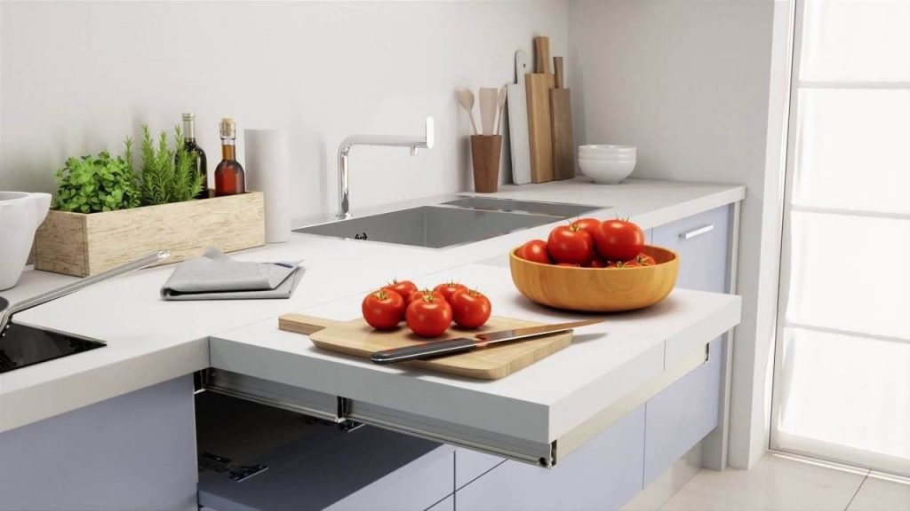 Под основной столешницей кухонного шкафа устанавливается дополнительная деталь. Движение облегчают гиды. Фурнитура крепится на боковых стенках шкафа и на торцевых частях выдвижного верха. Дверные доводчики обеспечивают плавную и бесшумную работу.