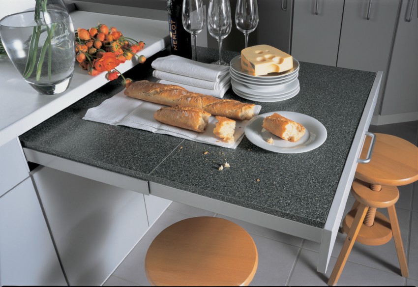 Раздвижные столы для небольших кухонь позволяют оптимизировать рабочее место.