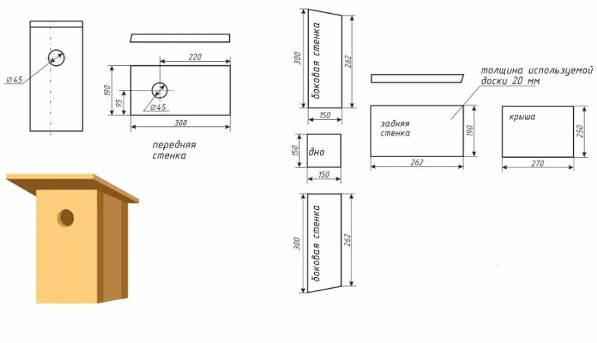 С целью создания безопасного и прочного скворечника предварительно целесообразно создать чертеж будущего строения, по которому впоследствии и осуществлять его возведение. Существует несколько вариантов изготовления птичьих жилищ: