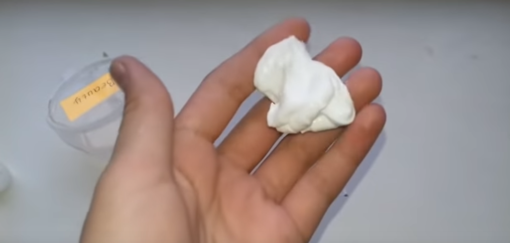 ПВА дает матовый, похожий на сливочное масло слайм. Клей сочетается с пеной для бритья: выходит хрустящий, упругий лизун.