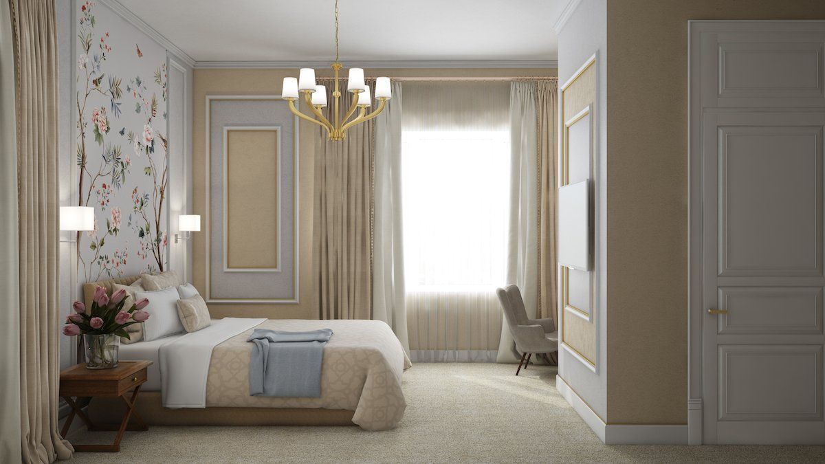 Еще одно решение – акцентная стена. Выберите спокойный оттенок, который поднимет настроение с утра, но при этом не утомит. Для проекта спальни дома в Подмосковье дизайнер Legko.com Юлия подобрала именно такой вариант.