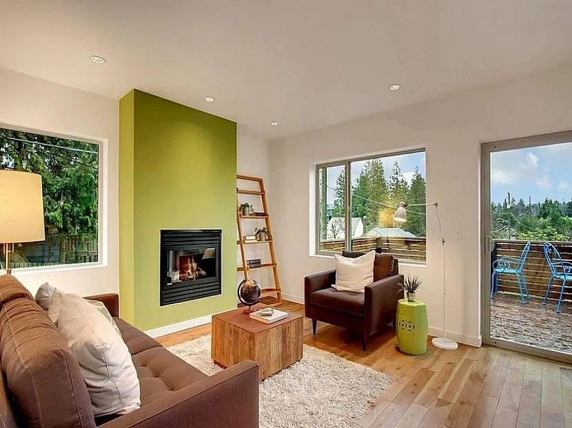 Зеленые стены и белый потолок являются отличным вариантом для гостиной