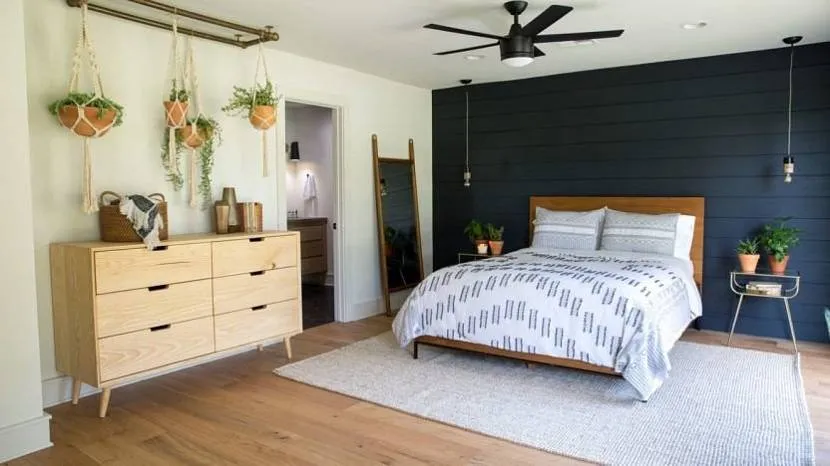 Одна стенка, отделанная вагонкой, является ярким акцентом внутри комнаты и служит теплоизоляцией.