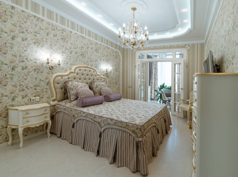 В зависимости от этой характеристики, владелец спальни определяет тип узора, его цвет и фактуру. Для потолков высотой менее 2,5 м выбирают полотна светлых тонов, на которых нет крупных узоров и грубой текстуры.