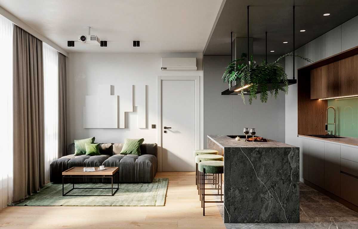 Обратите внимание, что дизайнер намеренно не стал визуально разрывать комнату на противоположные части и зелёные детали присутствуют в обеих частях