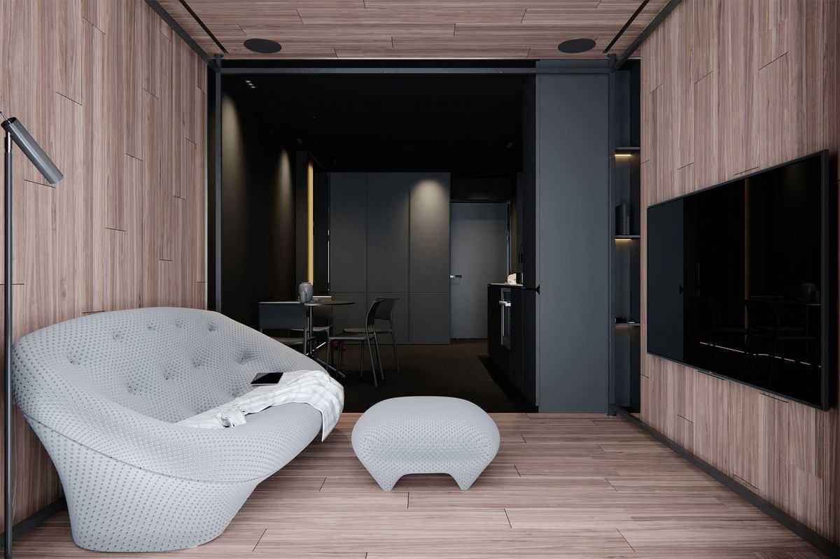 Визуальное зонирование комнаты, которая объединяет в себе гостиную и кухню. Смотреть другие фото проекта: Однокомнатная квартира оформленная в чёрном цвете