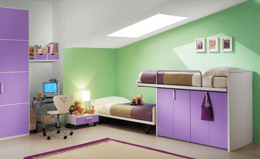 Выигрышно смотрятся контрасты в интерьере. Например, свело-зеленые стены (можно с рисунком), а сиреневые лишь акцентные детали.