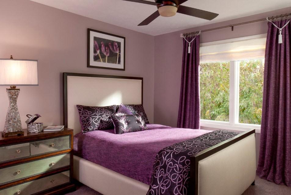 Оформляйте окно спальни фиолетовыми шторами, если стены более светлого оттенка, а напольное покрытие – белое или пастельных тонов.