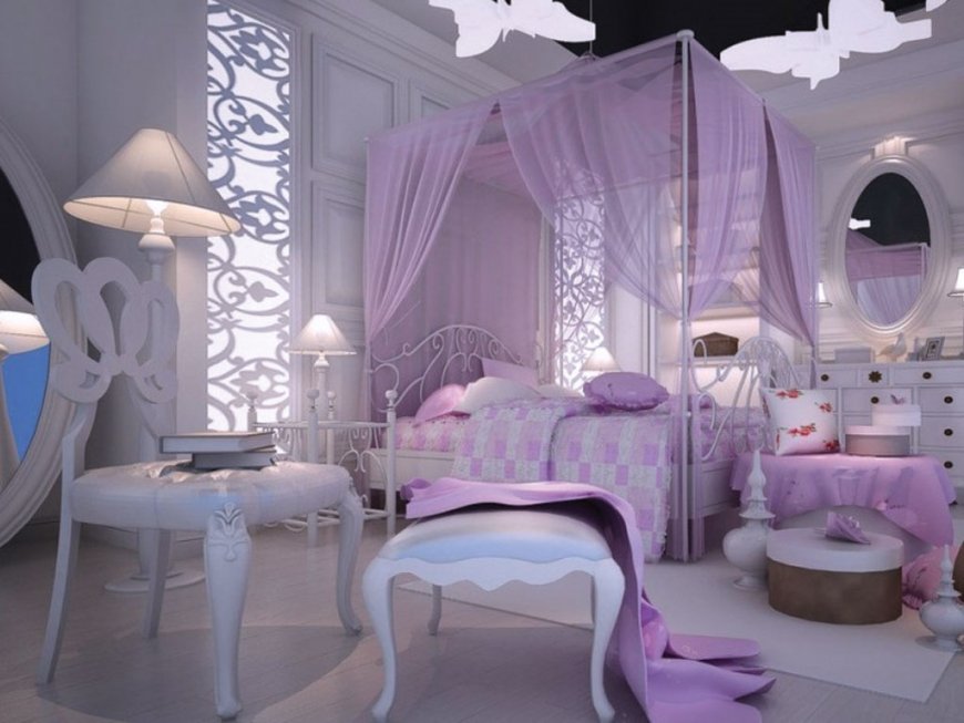 Романтический стиль станет отличным решением для юной мечтательной особы. Помимо светлых тонов для спальни в фиолетовом цвете можно использовать фуксию. Стены при этом желательно оклеить однотонными пастельной гаммы, а яркий акцент сделать при помощи и таких , как покрывала и подушки.