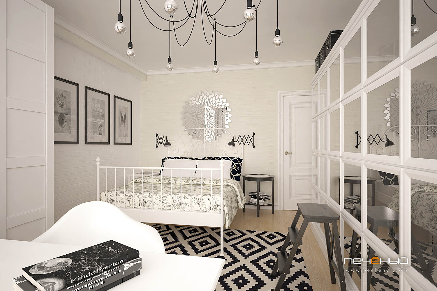 Что касается люстры, то тут вы можете и вовсе не «запариваться» над этим вопросом. Достаточно будет минималистической лампочки Ильича на чёрном проводе, свисающей над вашей кроватью.