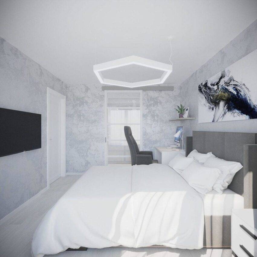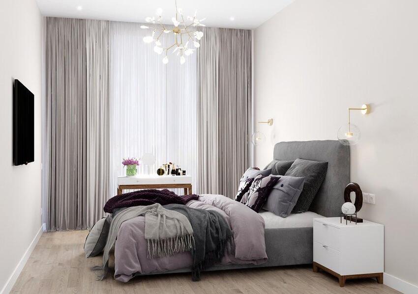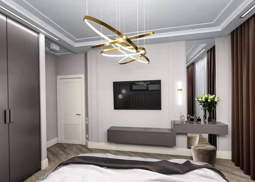 Главный источник освещения в спальне — это потолочная люстра. Для минималистичной спальни все светильники, включая люстры, должны иметь простую форму, лаконичный дизайн, четкую геометрическую форму.