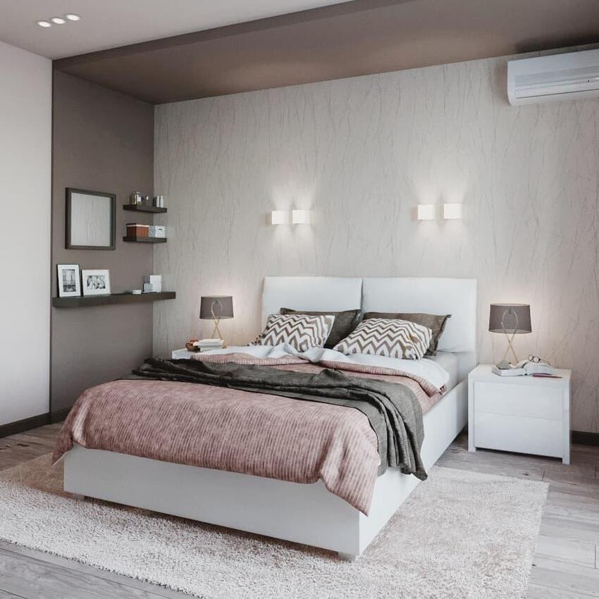 Визуальный центр — большая двухместная кровать. По обе стороны от нее — тумбочки с ночниками или настольными лампами. В дальнем углу — комод или полочки с вещами. Рядом можно разместить настенную полку с книгами для вечернего чтения.