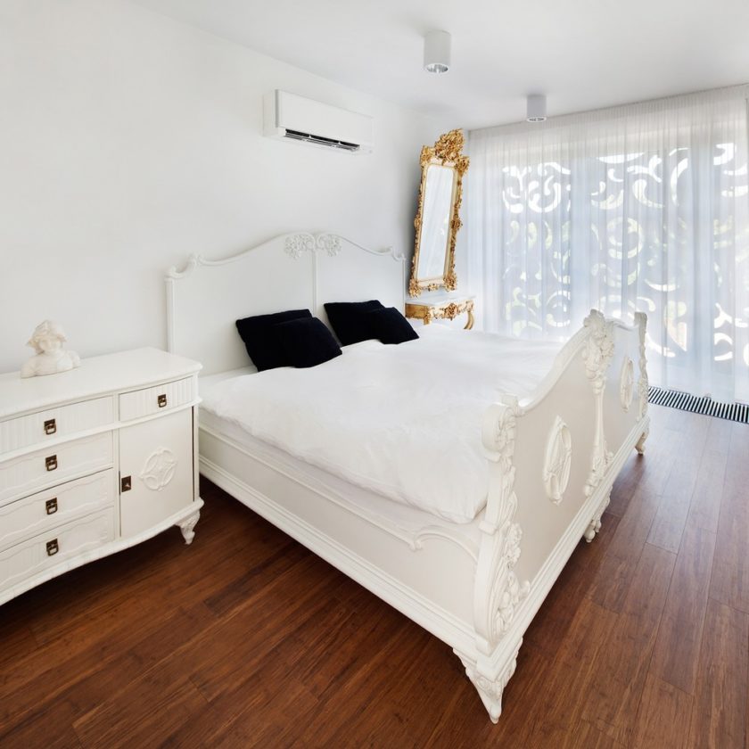 Предпочтение отдайте мебели из натурального дерева. Если нет возможности такую приобрести, пусть она будет из МДФ со вставками зеркал, матовых и цветных стёкол, со стильными деталями из металла. Так принято, что кровать ставят изголовьем у стены, обычно, перпендикулярно окну. Это для удобства.