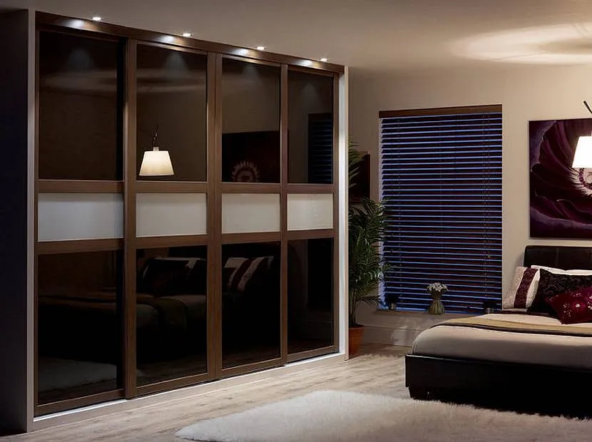 Встроенная мебель. Требует создания в спальне специальных ниш для установки шкафа или целой секции. Дверцы декорируются зеркалами, расписным стеклом или повторяют фурнитуру отделки стен.