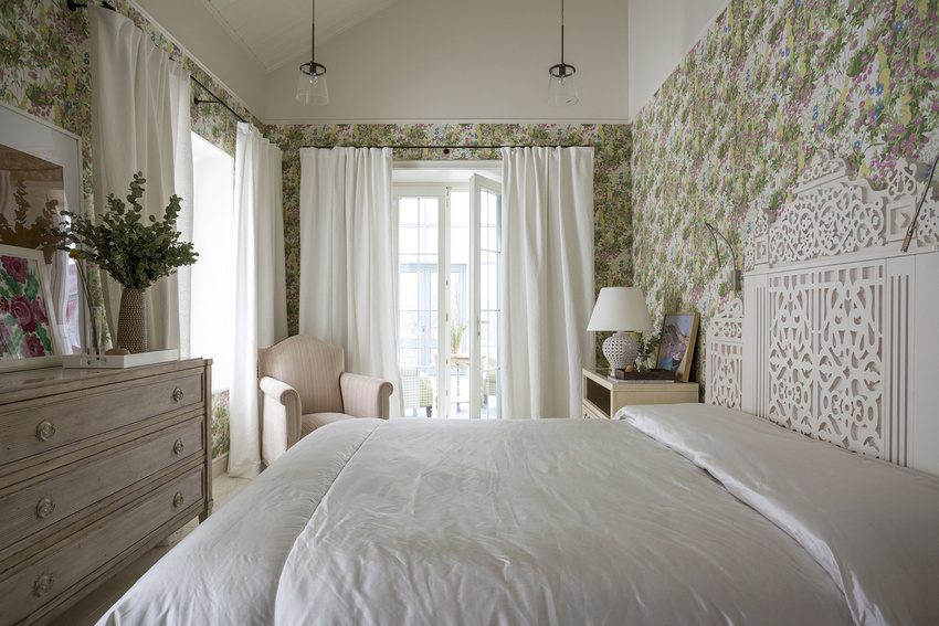 В больших спальнях загородных домов есть простор для фантазии. Стены можно оштукатурить, а в изголовье кровати создать элементы кирпичной кладки. Если окна высокие, стиль подчеркнут легкие прозрачные шторы, которые будут хорошо пропускать дневной свет.