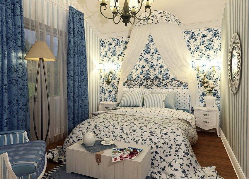 Спальни в хрущевке маленькие, и оформление их в стиле прованс нужно тщательно продумать. Стены можно оклеить обоями с изображением цветов, листьев. Если комната узкая, их лучше просто побелить. Это позволит визуально расширить пространство.