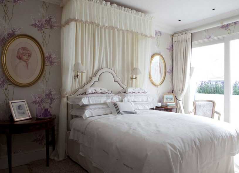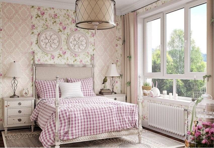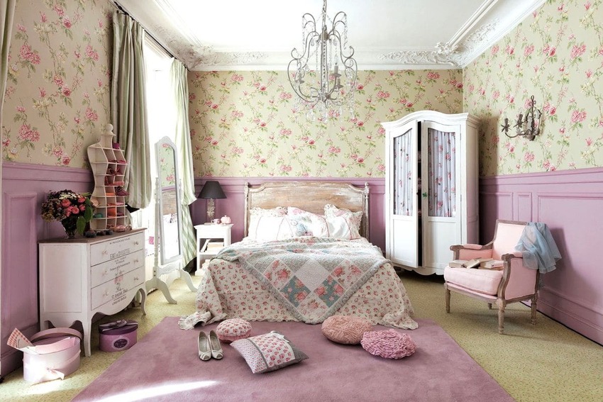 При недостаточном пространстве лучше добавить различного декора в интерьер с помощью милых сердцу аксессуаров. Пол должен застилать небольшой коврик тёплых тонов. Уместно разместить в спальне фарфоровые статуэтки, различные старинные рамки для картин, вазы с цветочным орнаментом и конечно же цветы, много цветов – не только нарисованных, но и живых пионов, роз.