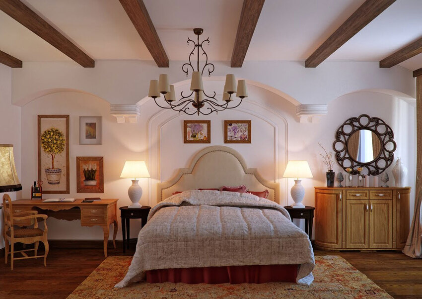 Кровать лучше застелить домотканым покрывалом. Стиль подчеркнут деревянные двери, вид каменной кладки или брусьев из дерева на одной из стен, покрытый досками с естественной фактурой или плиткой под натуральный камень пол.
