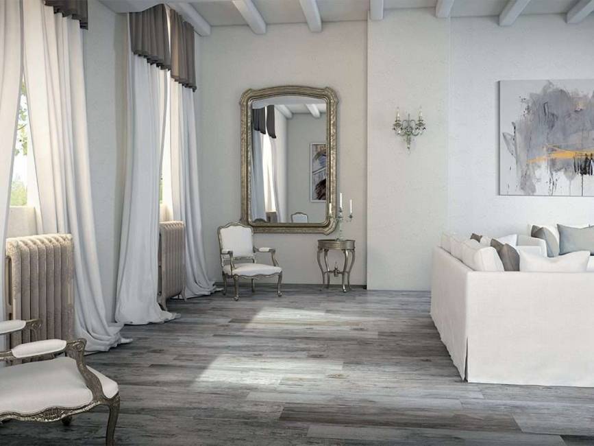 - пол – массивная доска, каменная плитка или современный ламинат, имитирующий дерево;
