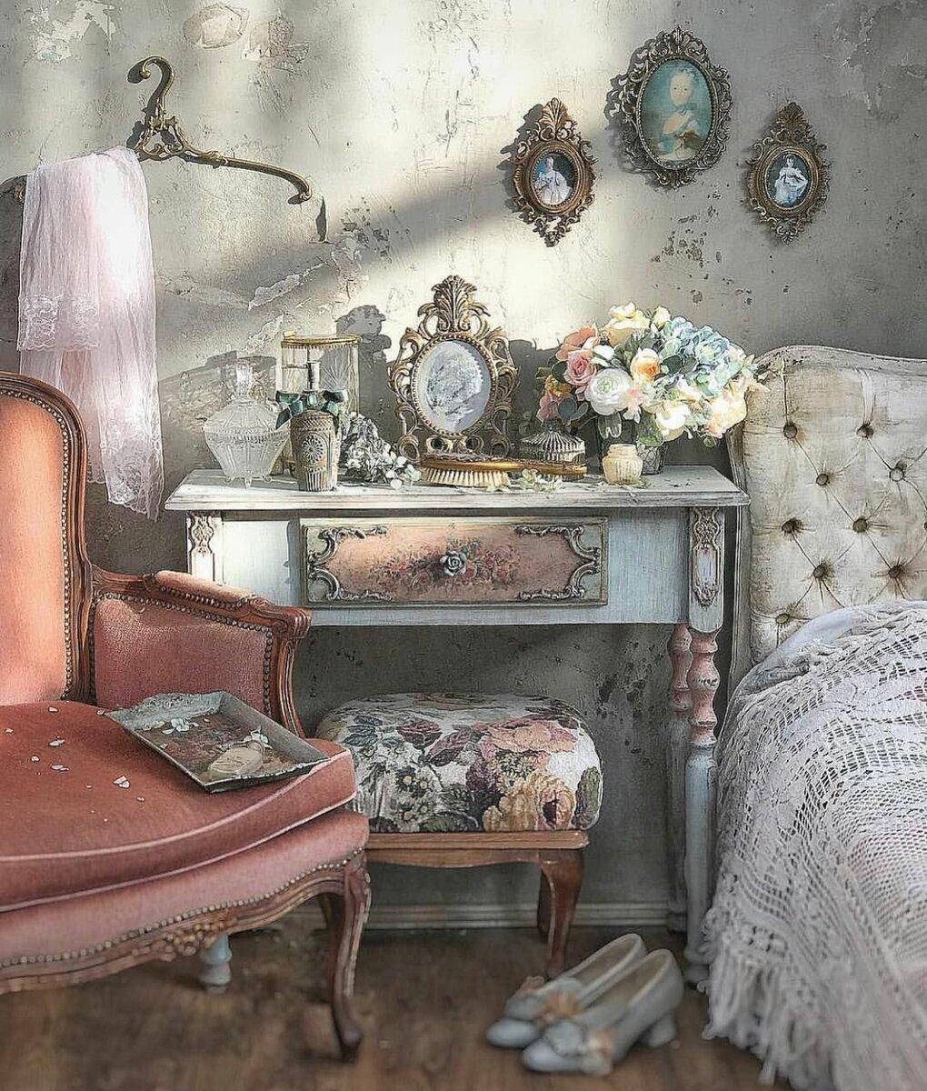 Если у вас есть возможность расположить в интерьере своей спальни действительно антикварные или просто настоящие старые вещи — это хорошо. Однако их всё равно придётся отдать дизайнеру, чтобы привести их в надлежащий вид. Я вот думаю, что по этому поводу не стоит так уж сильно заморачиваться. Для стиля shabby chic гораздо удобнее использовать специально изготовленные и искусственно состаренные вещи и предметы интерьера. Мебель покрывается разными слоями краски, которые потом зачищаются и специально обрабатываются, так что она выглядит ничем не хуже настоящего антиквариата, но при этом прочнее и удобнее.