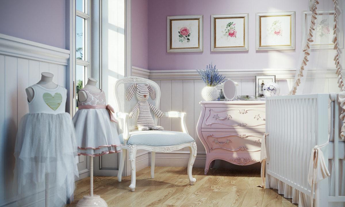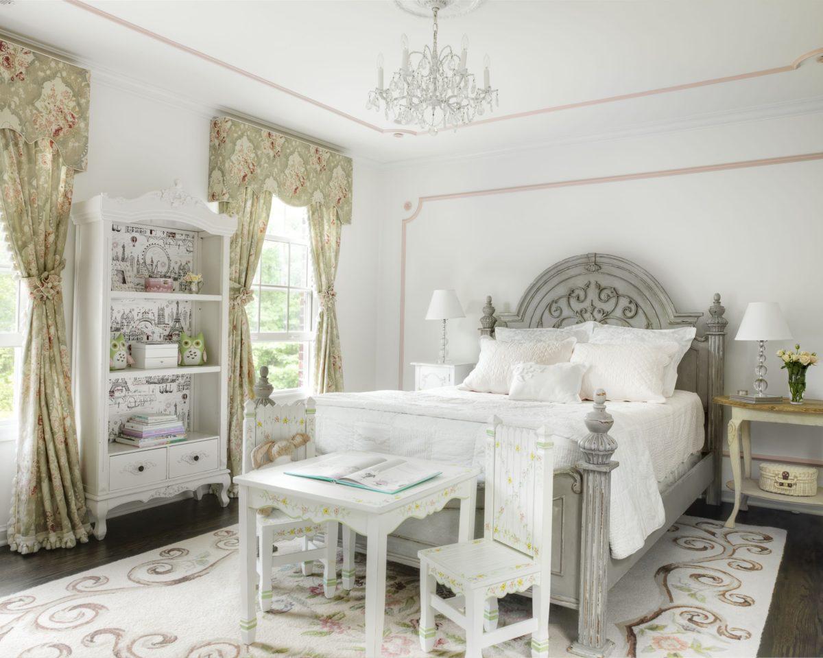 Дополнить мебельный комплект помогут аксессуары. Постелите на кровать покрывало нежного кремового цвета с многочисленными рюшами и не забудьте о декоративных подушках с оборками. На стол можно поставить изящную вазу, а под нее подложить салфетку с кружевами.