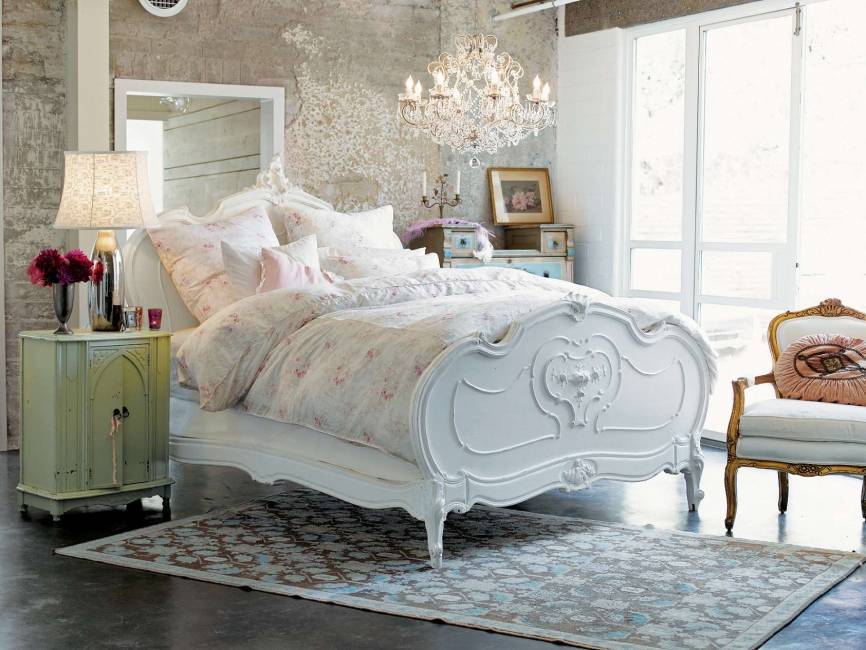Кровать – главный элемент спальни. Лучшим выбором спального места станет кованая конструкция с максимальным количеством декоративных элементов, окрашенная в светлый оттенок. Если у владельца имеется старая кровать, оставшаяся от бабушки, то она подойдет сюда как нельзя лучше. Именно в этом стиле такой предмет будет смотреться модно, а не как изжившая себя мебель.