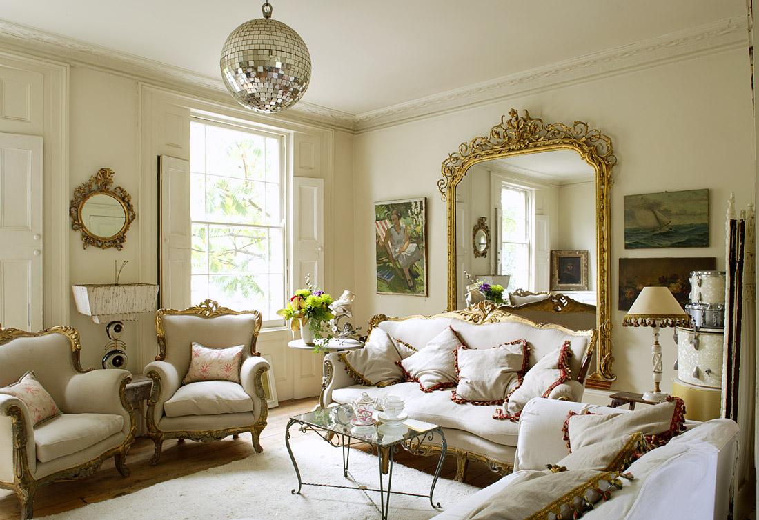 Особого уюта добавит наличие камина, и не важно – классического с коваными элементами или только имитации. Из декора подойдут старинные зеркала, шкатулки, картины, светильники с тканевыми абажурами, подсвечники, гипсовые скульптуры, небольшие ковры и красивые занавески с лентами и кружевами