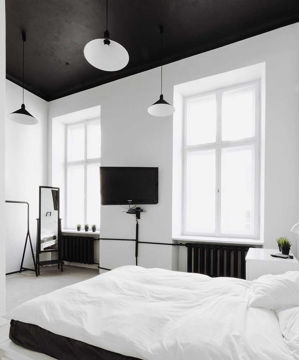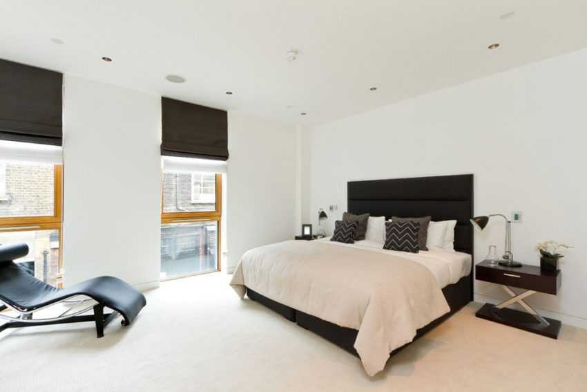 Если в спальне больше белого цвета, то особое внимание стоит уделить предметам декора. Они должны быть черными: