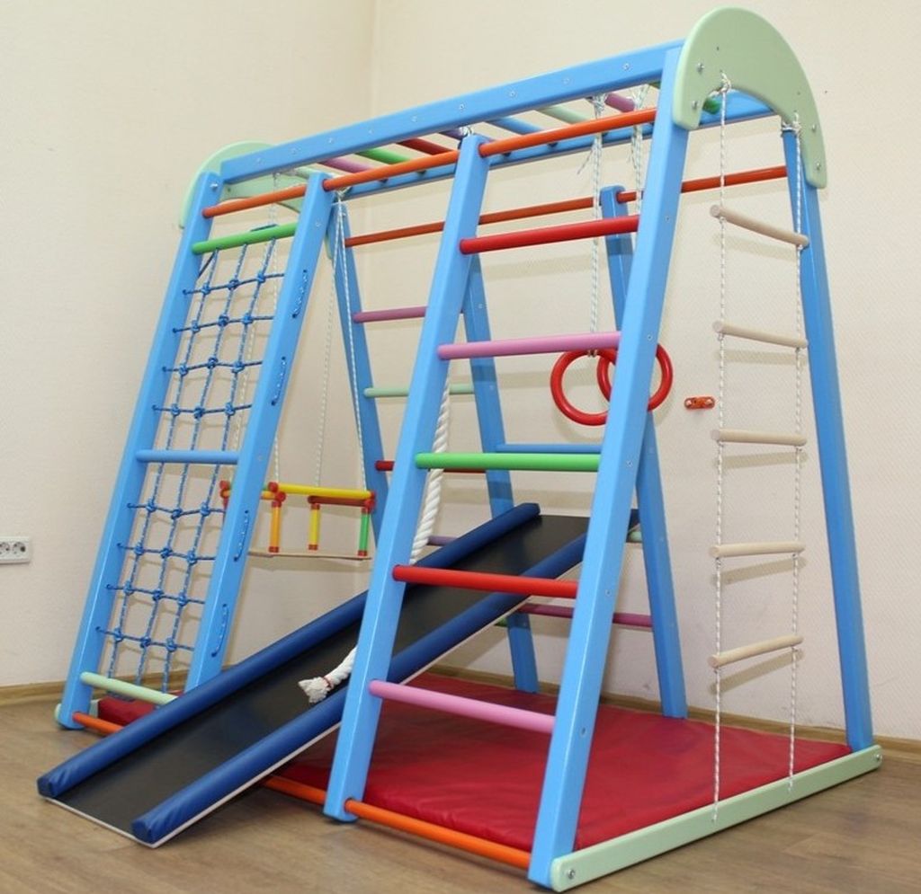 Есть конкретные требования к спортивным уголкам для малышей в жилую площадь. Выбор деталей частей зависит от возраста. К примеру, горку с матом и маленькой лесенкой можно покупать от года. Для малышей 4-7 лет дополните комплекс кольцами для гимнастики, качелями из древесины, а еще канатом и трапецией. Для подростков можно выбрать кольцо для баскетбола, боксерскую грушу, турник и скамейку для качания пресса.