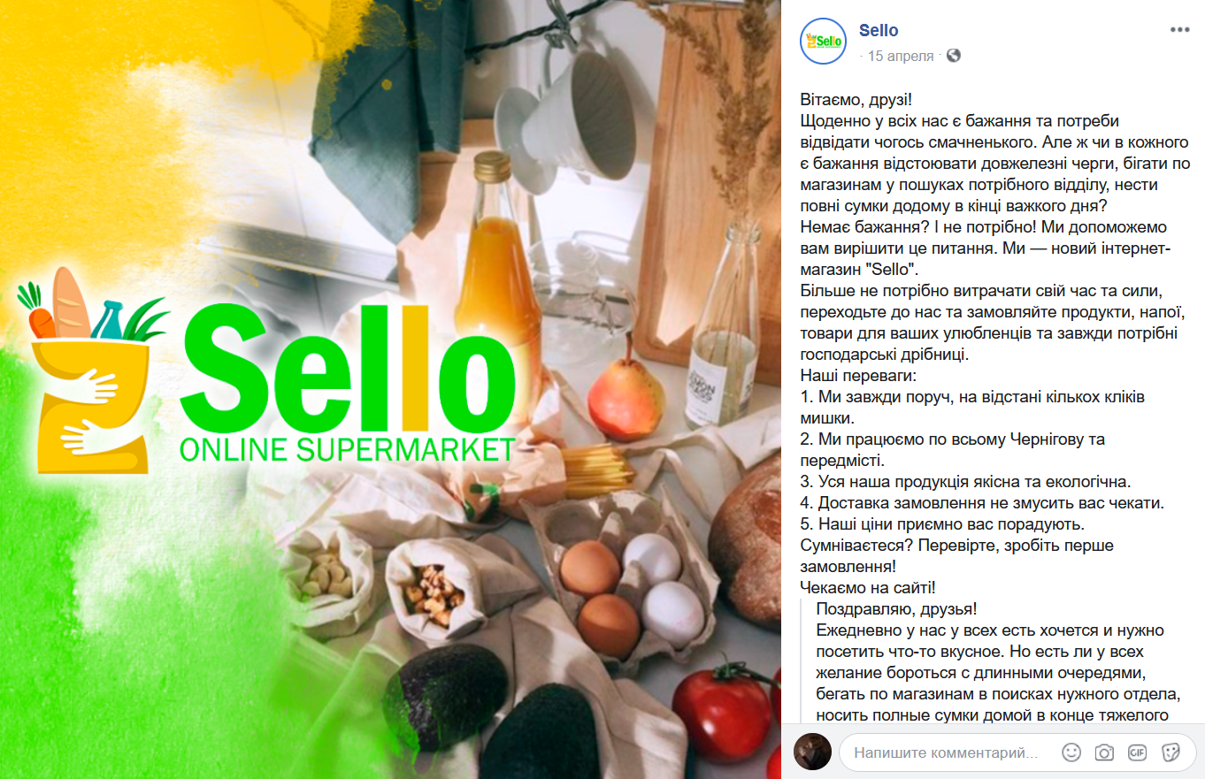 Пост от онлайн-супермаркета Sello на Facebook