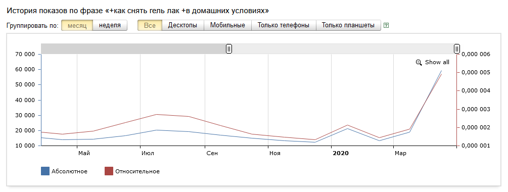 Например, вот как подскочило количество запросов по фразе «как снять гель лак в домашних условиях»: