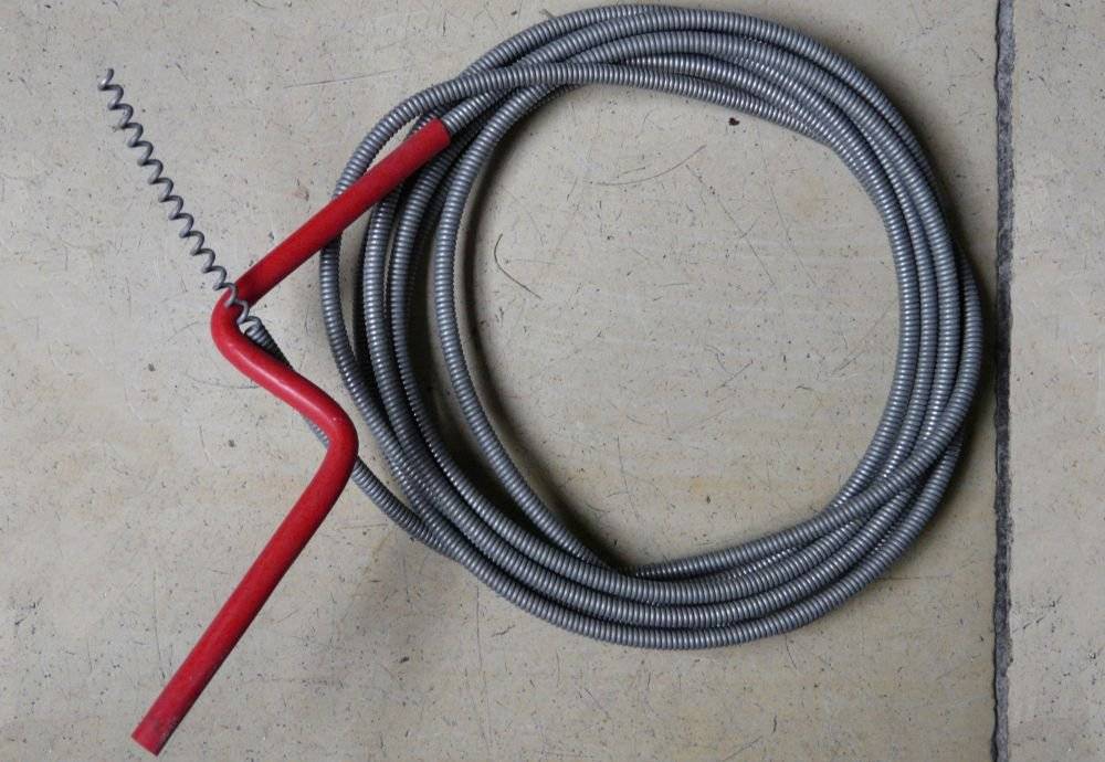 Поможет пробить уплотнившуюся пробку специальный трос, оснащенный ручкой. Его помещают в отверстие слива и вращают. Волосы, текстильные волокна накручиваются на конечную насадку и извлекаются вместе с тросом наружу. Остальные частицы становятся рыхлыми и легко смываются в канализацию большим количеством воды. Не используют трос, если материал труб или сифонов — латунь, хромированная сталь, пластик.