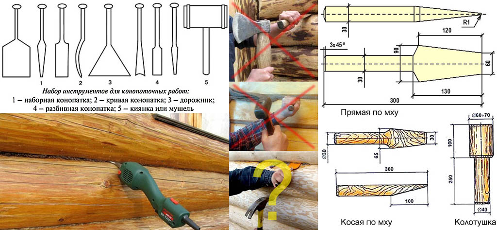 Конопатка деревянного сруба на долгий срок службы не из тех работ, которые возможно выполнить подручными средствами. В старину многие временные рубленые строения, напр., охотничьи домики, сараи и пр., конопатились наскоро топором и тупой стамеской или обломком дерева. Полезла конопать – ну, напихаем еще, не бог весть что. Но ныне сруб дорогое удовольствие и показатель престижа. Переконопатка отделанного заселенного дома сложна, и сильно сокращает срок его службы, так что, затевая ставить сруб, необходимо приобрести и конопаточный инструмент.