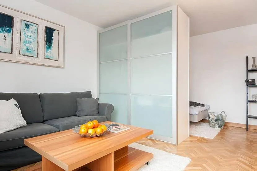 К перегородкам-трансформерам относят и раздвижные разделители, которые выполняют роль двери. Обычно их выполняют из дерева или стекла.