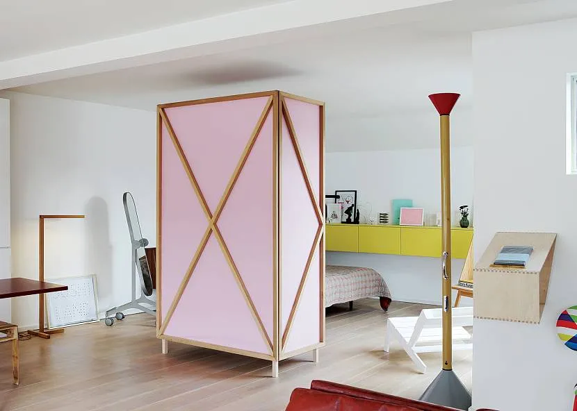 Самый простой вариант трансформируемой перегородки — это ширма, состоящая из отдельных стоек, обтянутых прозрачным или плотным текстилем. Некоторые модели представлены стойками на колесиках. Металлический каркас можно складывать, что позволяет убирать разделитель в угол, где он не займет много места.