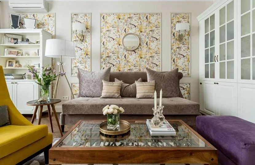 В роли разделителя пространства комнаты можно использовать диван. Чаще всего именно стену за ним выбирают акцентной. Если этот предмет мебели слишком громоздкий, то над ним можно расклеить серию картин или триптих.