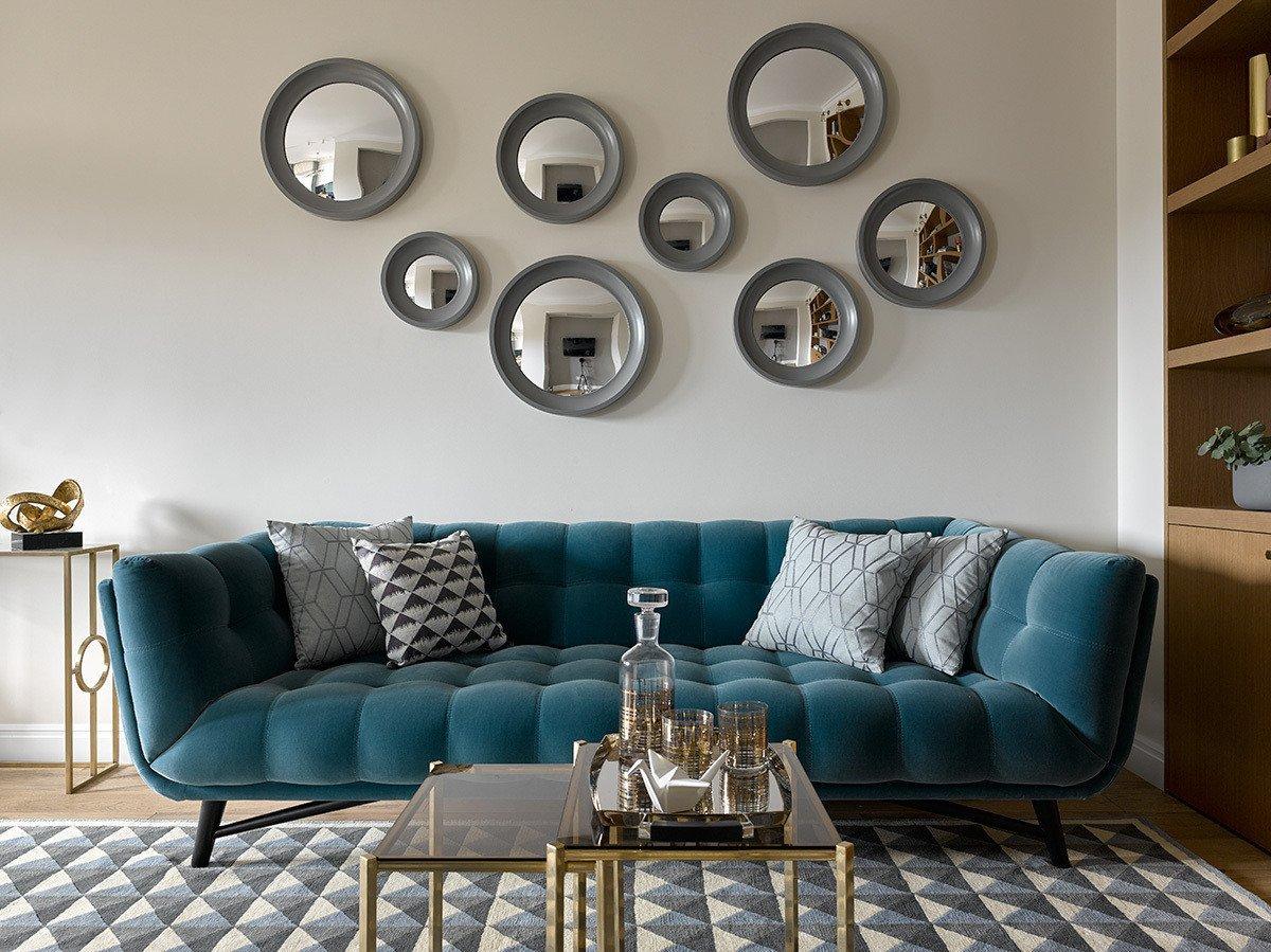 Старинное зеркало, доставшееся по наследству, вполне претендует на гордое звание антиквариата и потому поместить его на стену над диваном уместно. Добавьте к нему состаренную раму, несколько старинных предметов и винтажное украшение стены будет готово. Семейные портреты предыдущих поколений тоже подойдут в компанию к зеркалу.