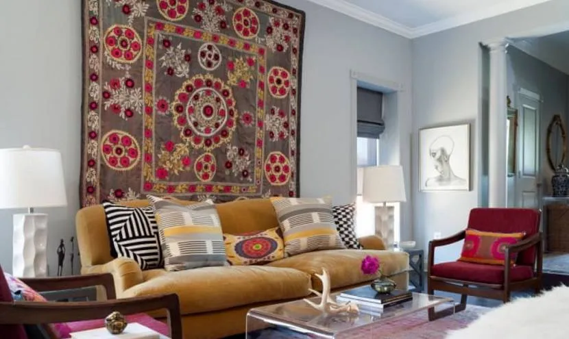 Гостиная с ковром на стене, повешенном над диваном Источник goodsgn.com