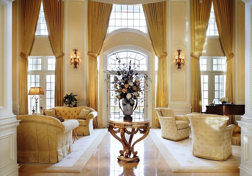 Диваны и кресла в роскошном интерьере не накрывают чехлами и покрывалами. Допустима только обивка, причем дорогими тканями или кожей.
