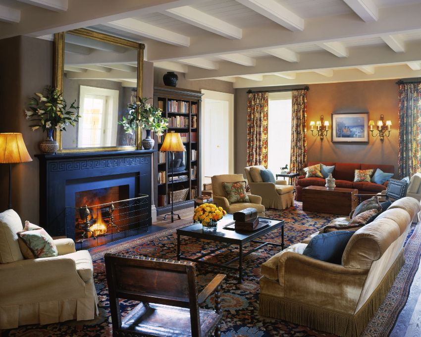 Важной деталью классической гостиной является камин. В загородном доме он может быть настоящим функциональным предметом