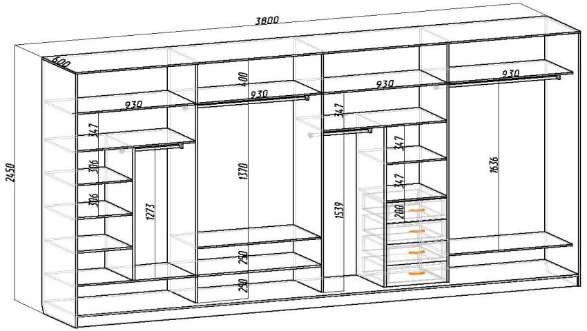 - Составлен чертеж с размерами всех элементов шкафа-купе.